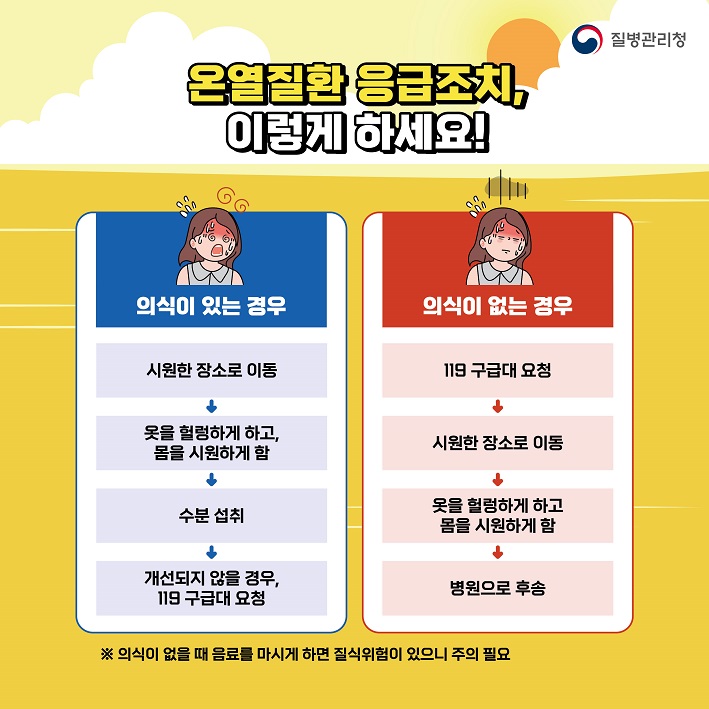 · 의식이 있는 경우 : 시원한 장소로 이동 → 옷을 헐렁하게 하고, 몸을 시원하게 함 → 수분 섭취 → 개선되지 않을 경우, 119 구급대 요청