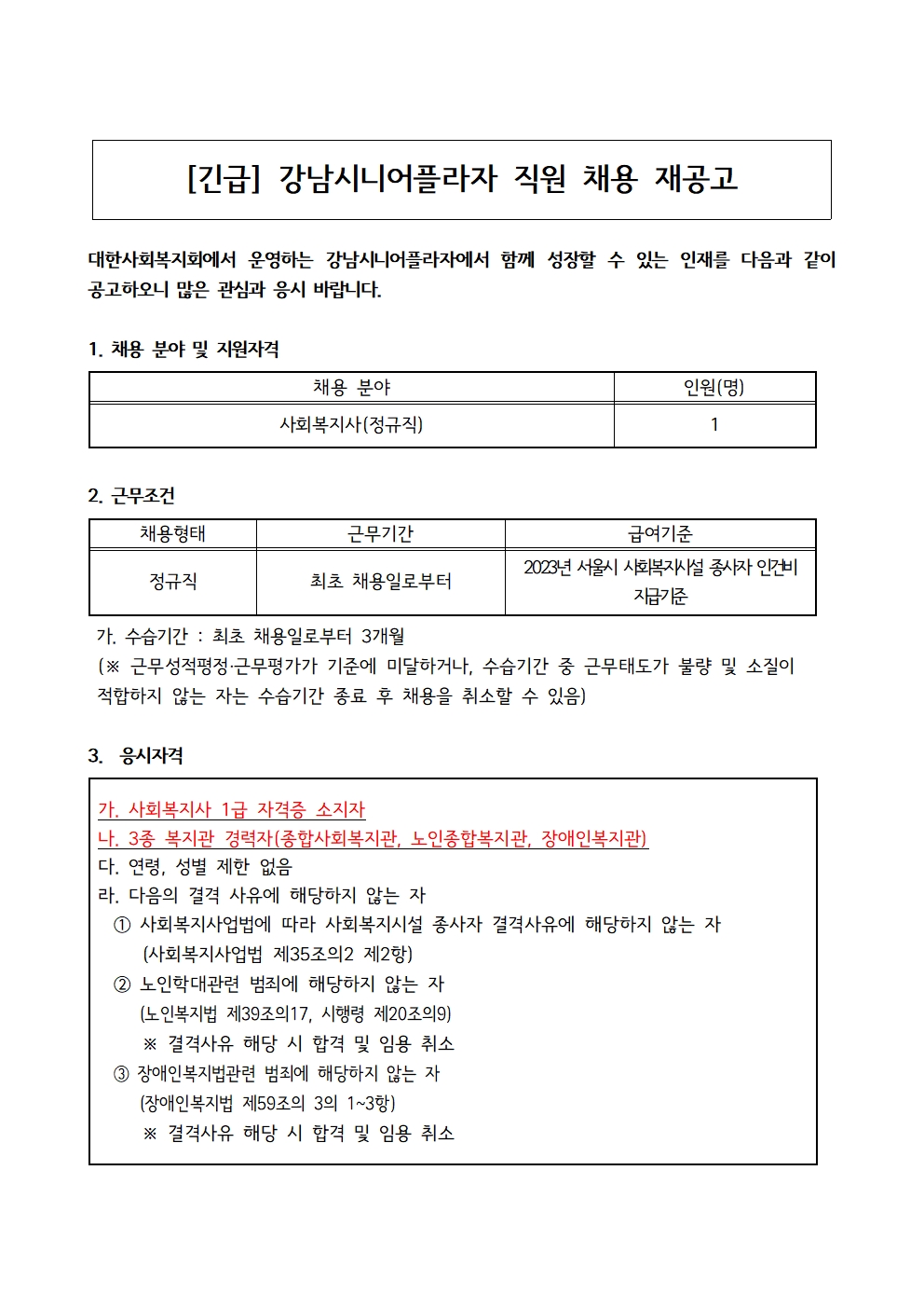 [채용공고] 강남시니어플라자 직원 채용 재공고(긴급)
