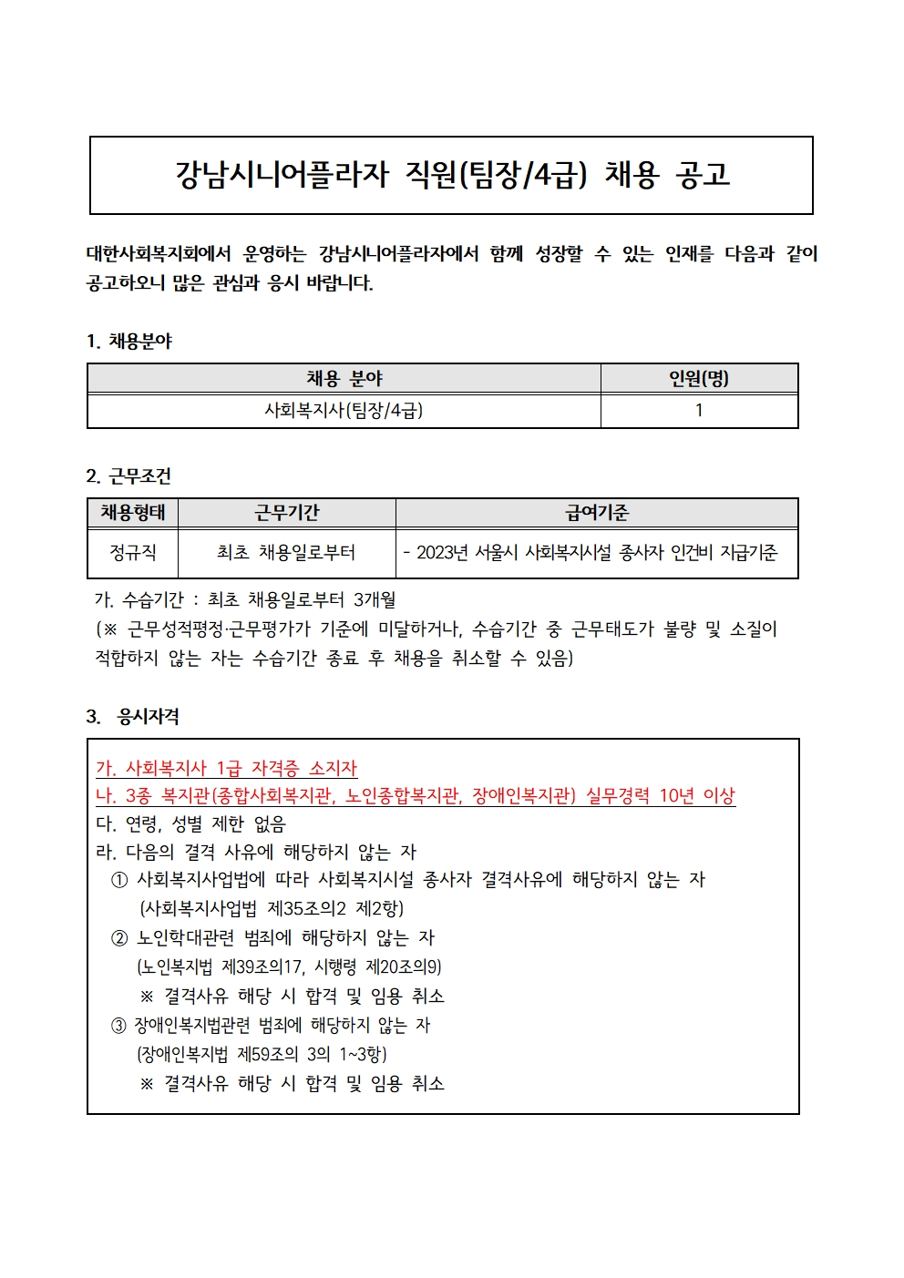 [채용공고] 강남시니어플라자 직원(팀장/4급) 채용 공고