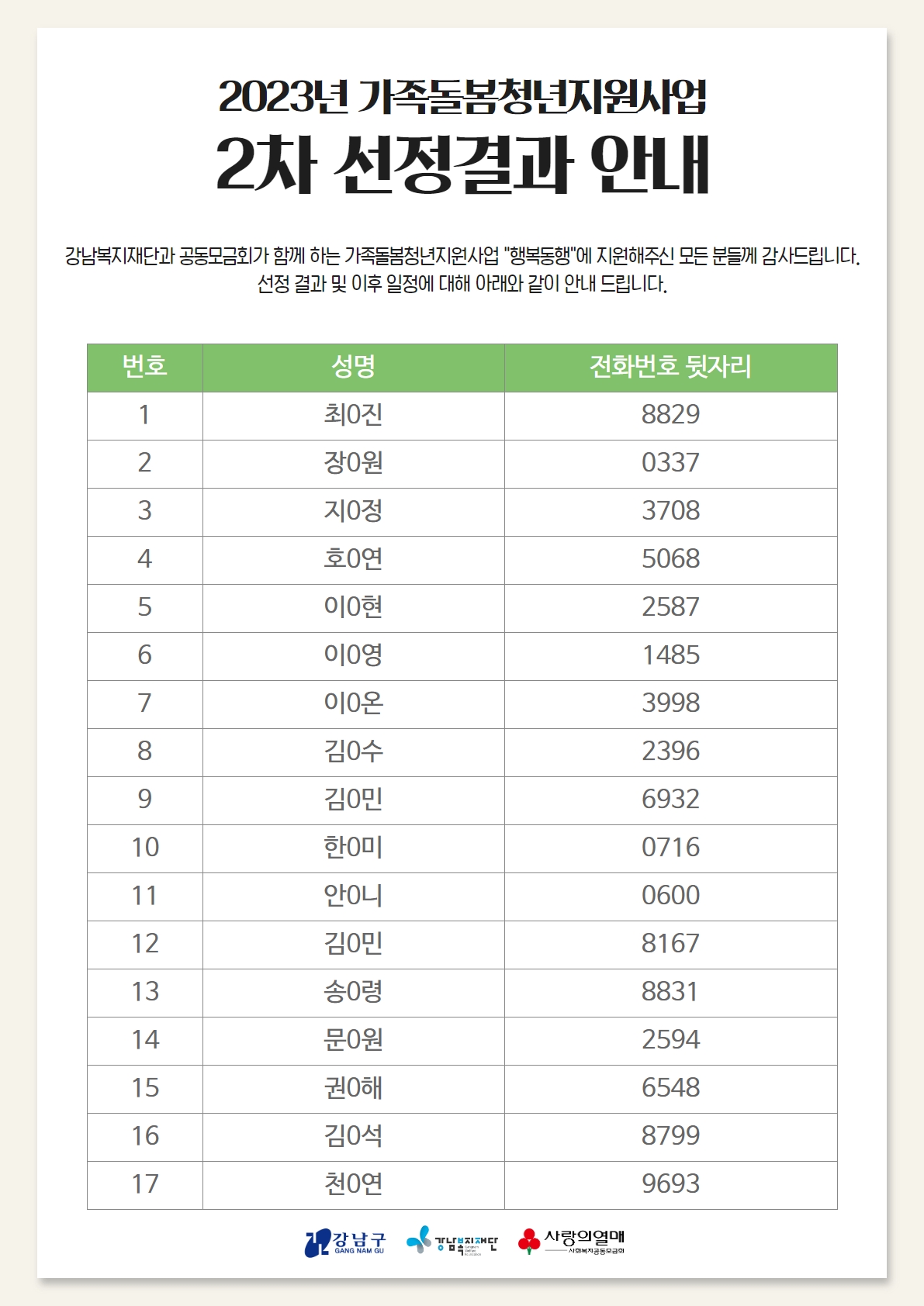 2023년 가족돌봄청년지원사업 2차 선정결과 안내입니다.