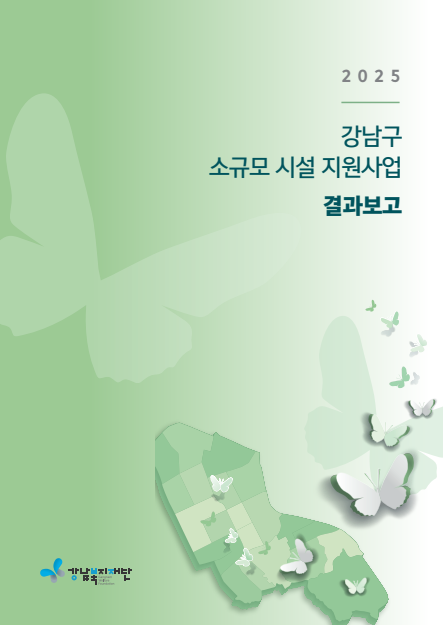 안녕하세요. 강남복지재단입니다. 「강남구 소규모 시설 지원사업 결과보고」가 발간되었습니다. 강남복지재단은 앞으로도 복지현장에서 애쓰고 계신 소규모 시설 종사자분들의 환경개선을 위한 지원에 더욱 힘쓰겠습니다. 감사합니다.