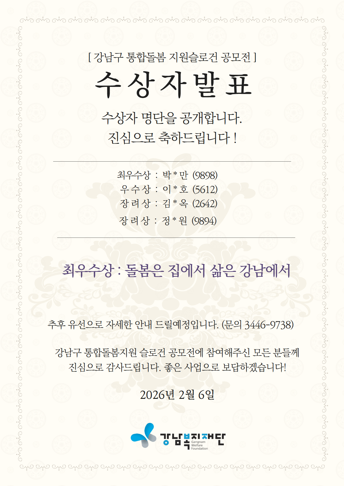 강남구 통합 돌봄 지원 슬로건에 참여해 주신 모든 분들께 감사드립니다