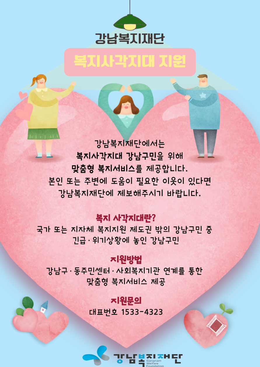 본인 또는 주변에 도움이 필요한 이웃이 있다면 강남복지재단에 제보해주시기 바랍니다.