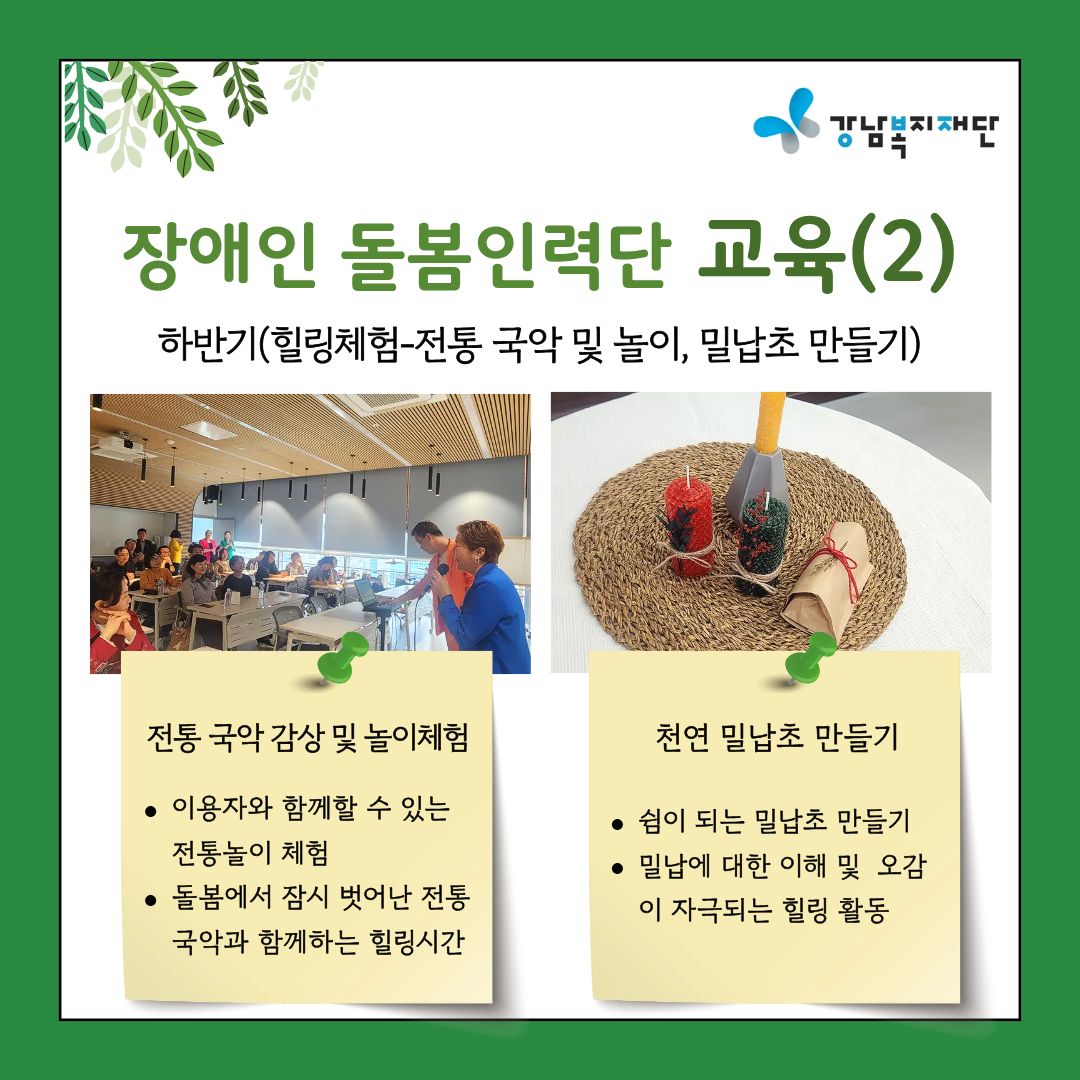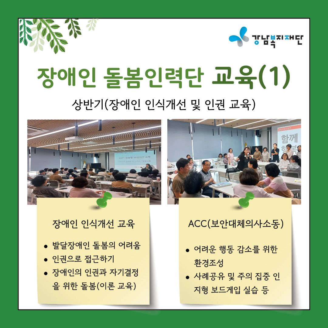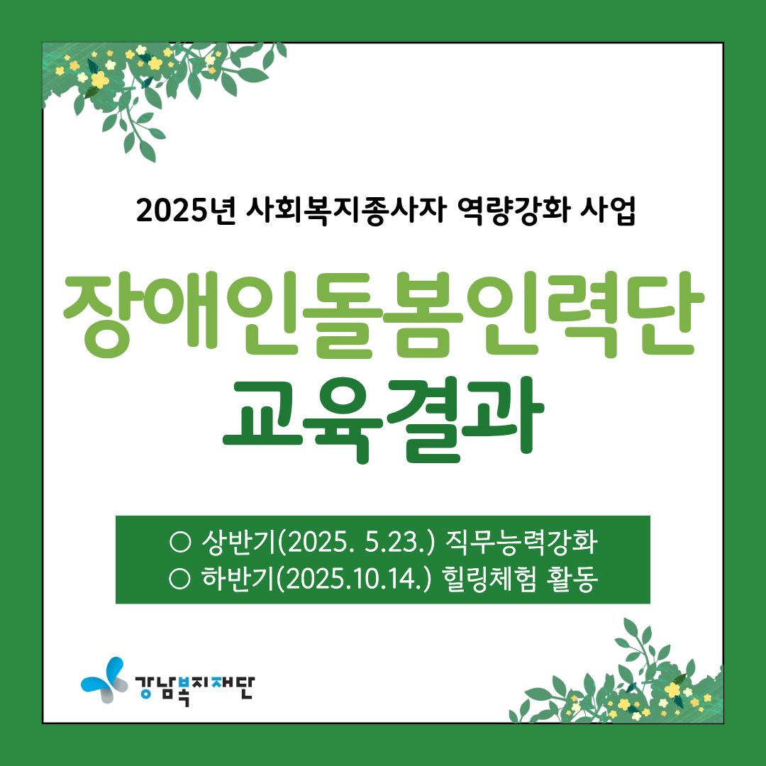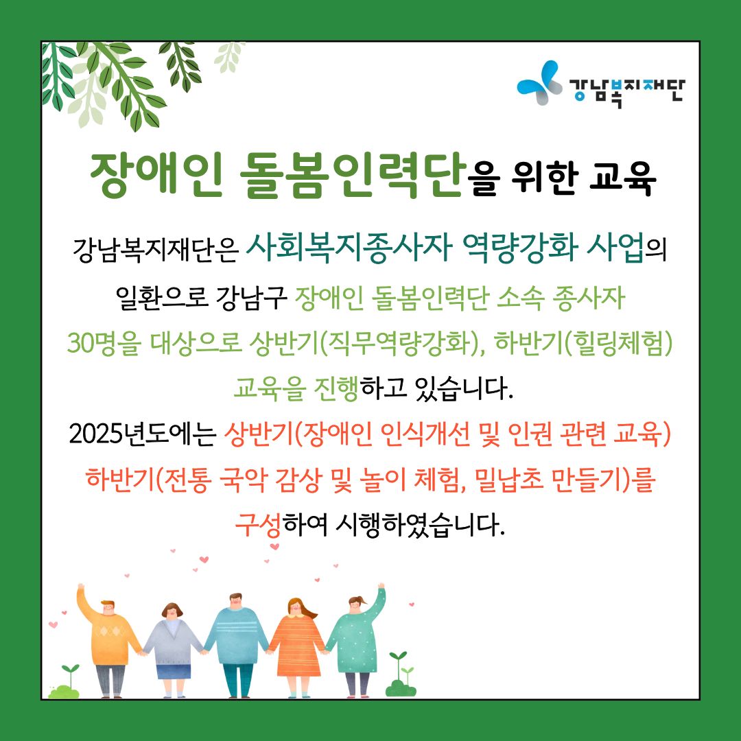 강남복지재단은 사회복지종사자 역량강화 사업의 일환으로 강남구 장애인 돌봄인력단 소속 종사자 30명을 대상으로 상반기(직무역량강화), 하반기(힐링체험) 교육을 진행하고 있습니다.
