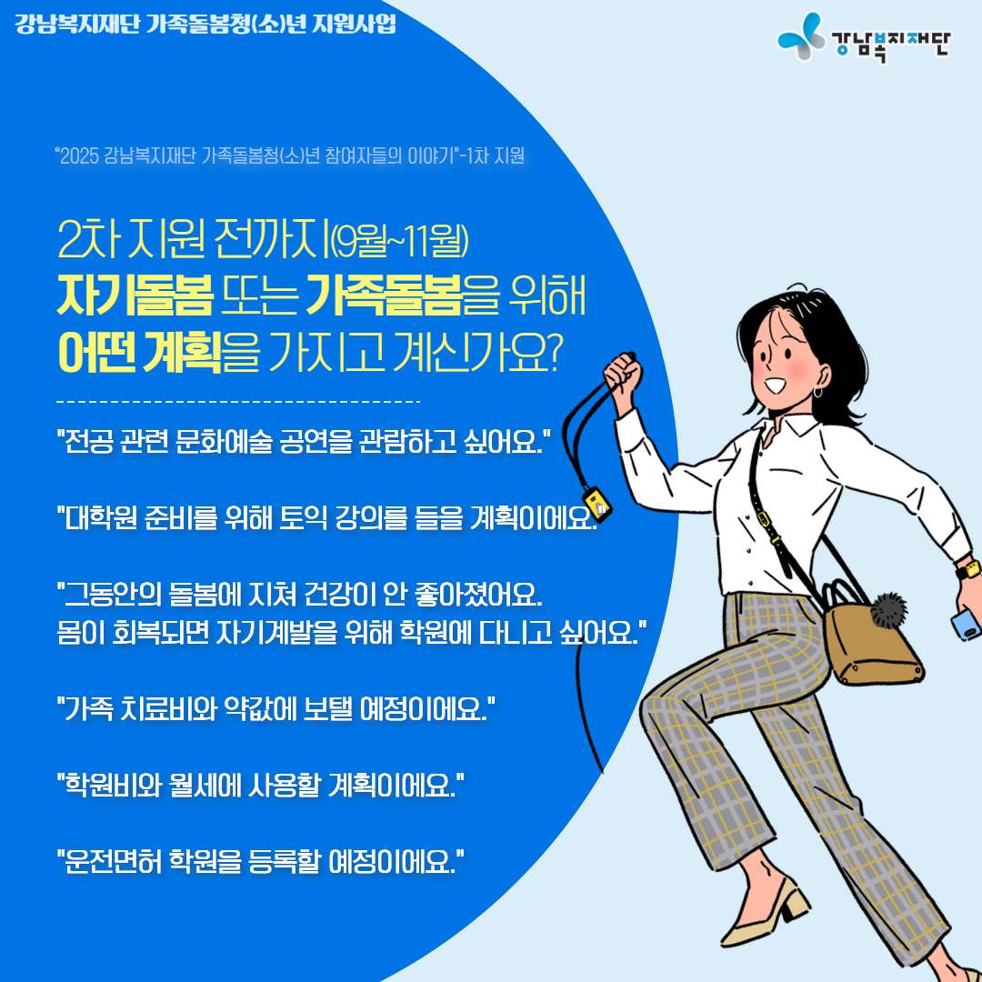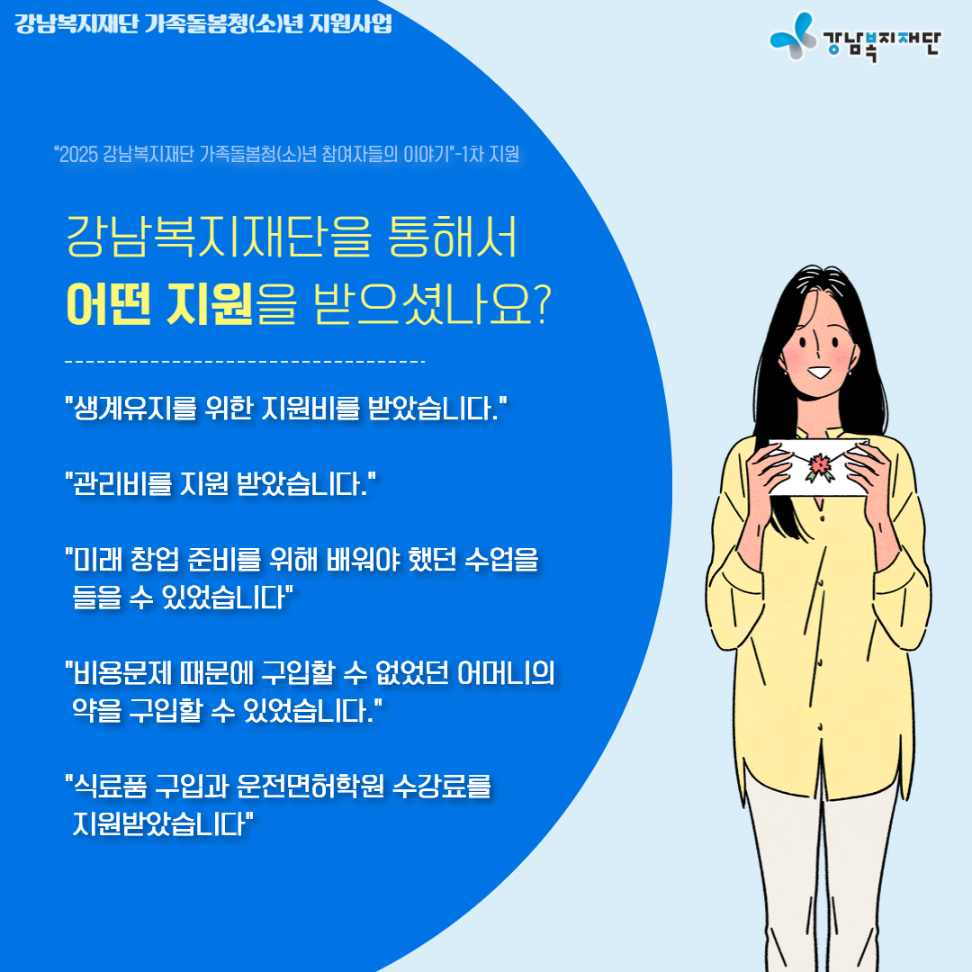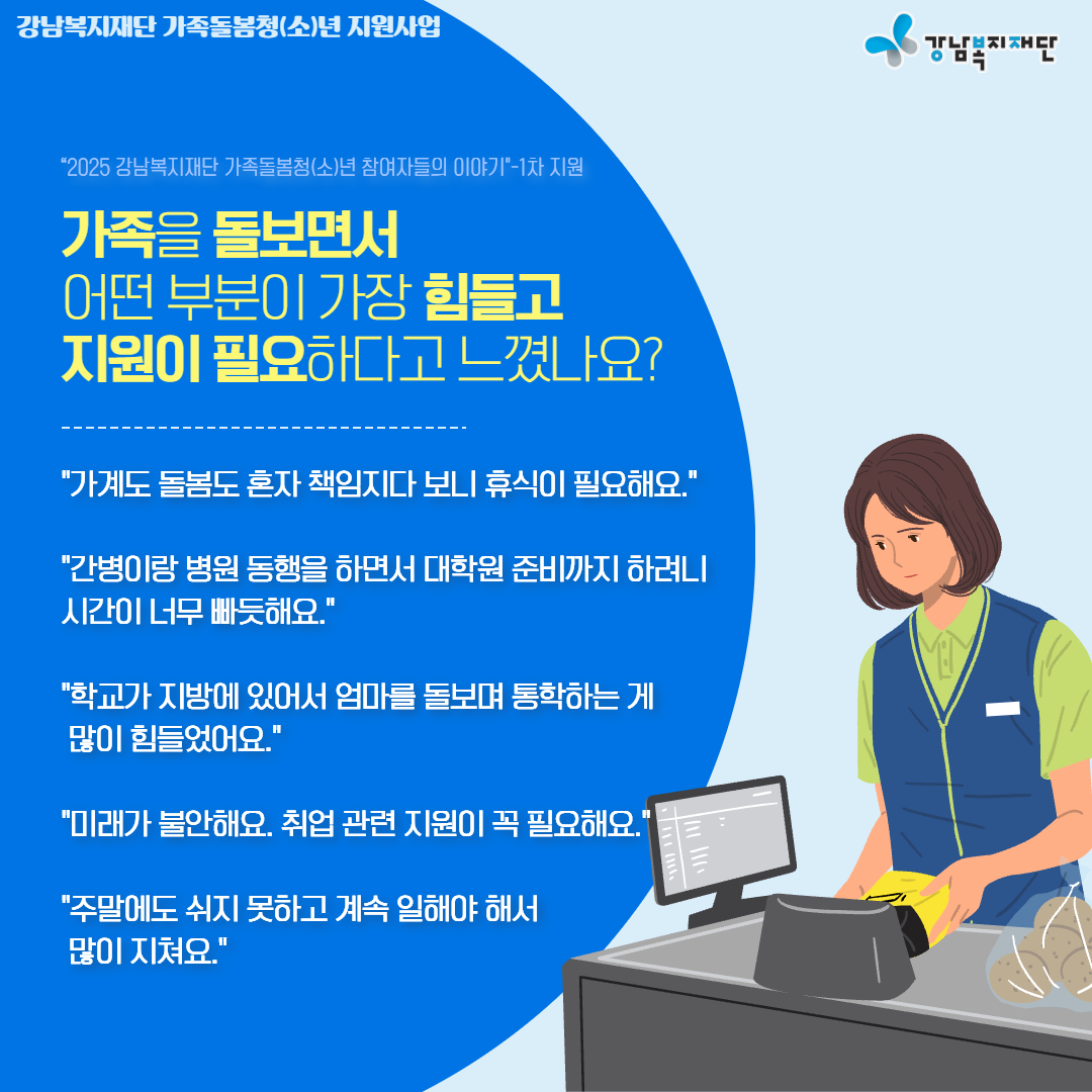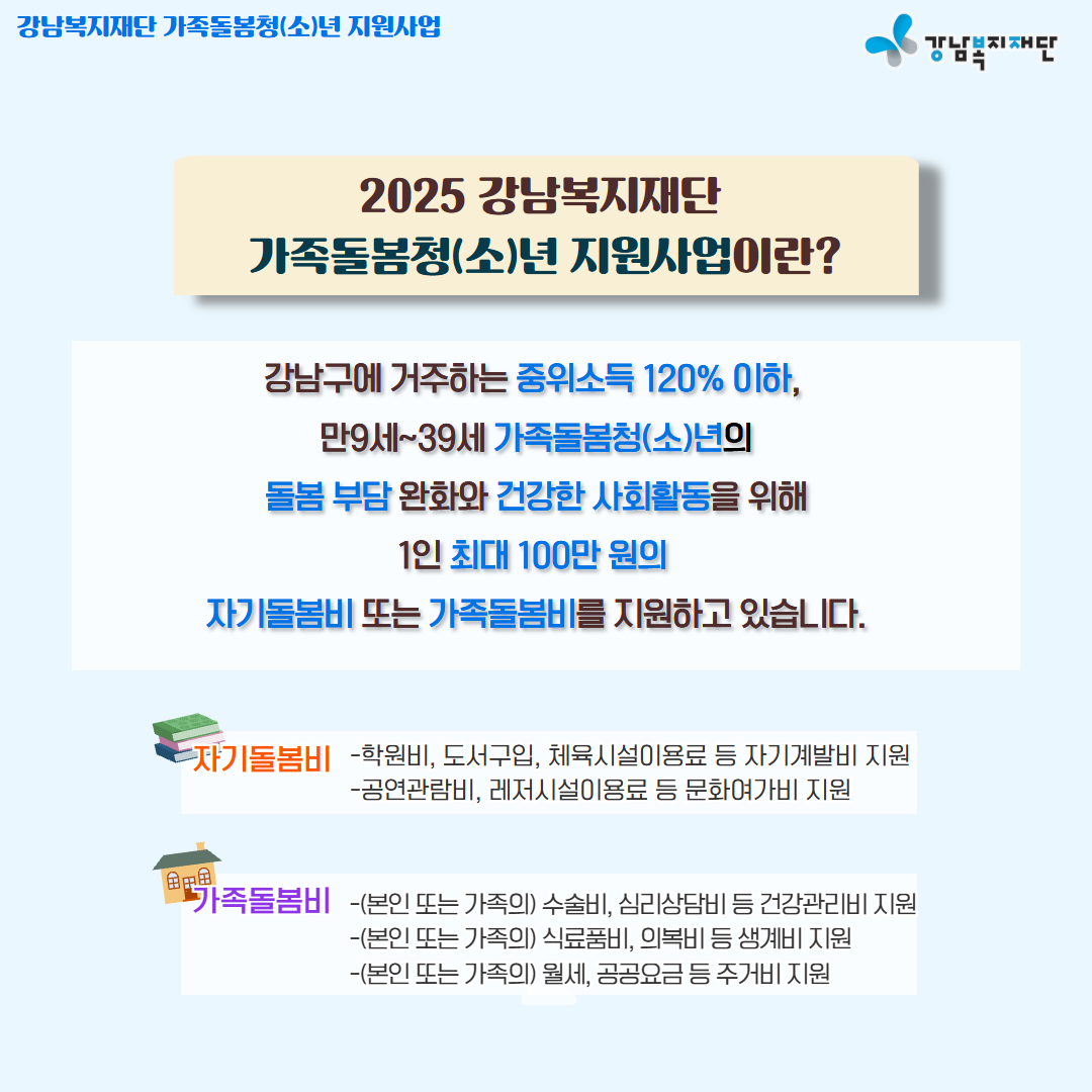 강남복지재단은 가족 돌봄으로 인해 개인의 학업이나 사회활동이 어려운 청(소)년을 지원하기 위해 ‘가족돌봄청(소)년 지원사업’을 추진하고 있습니다.