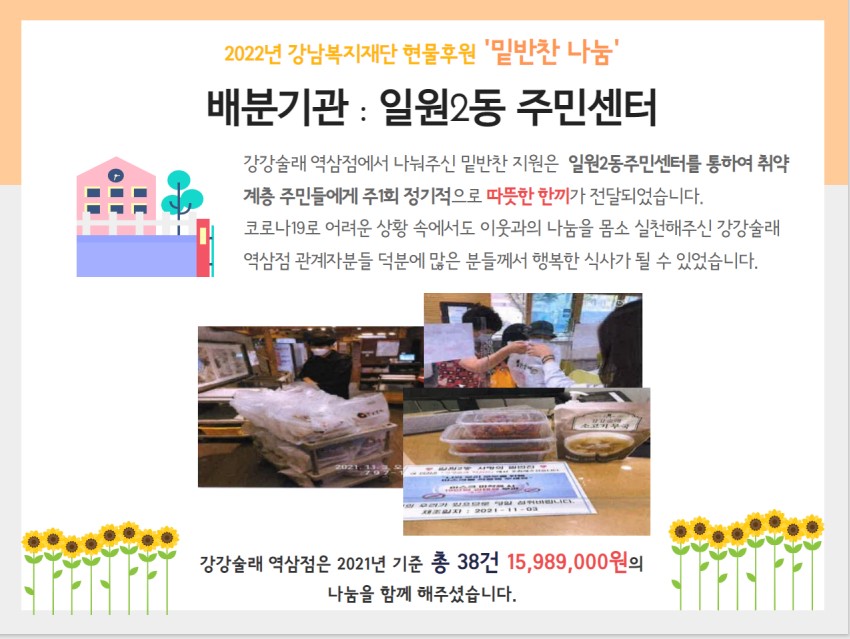 전한 강강술래 역삼점에서는 강남구 취약계층의 따뜻한 한끼 식사를 위하여 2020년부터 꾸준히 주 1회 정기 밑반찬 나눔에 동참해 주고 계십니다.