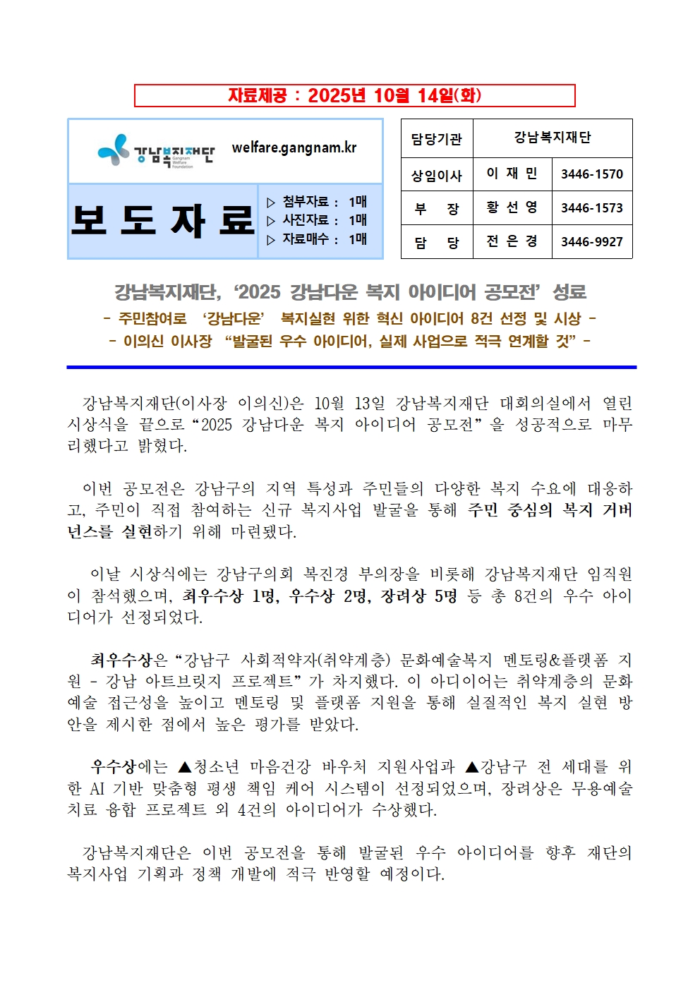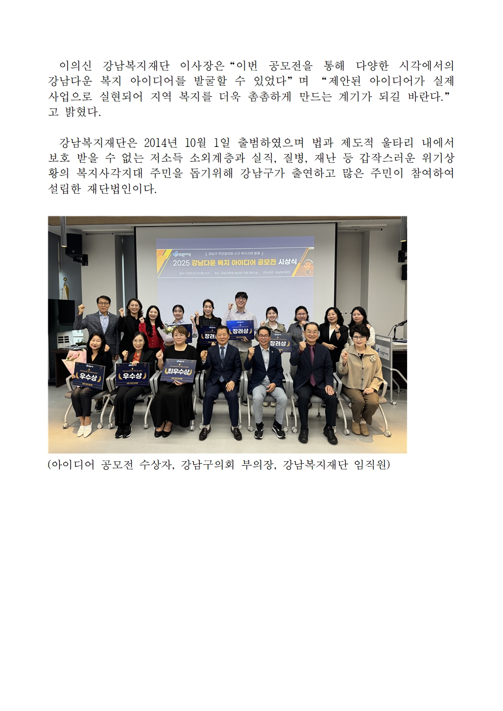 강남복지재단,‘2025 강남다운 복지 아이디어 공모전’성료