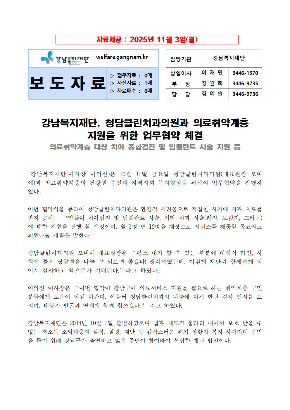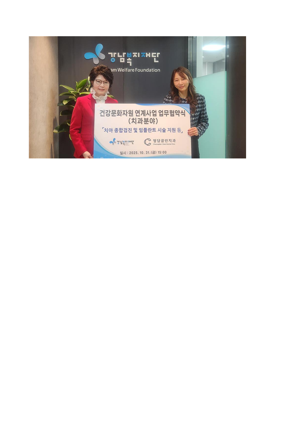 강남복지재단, 청담클린치과의원과 의료취약계층 지원을 위한 업무협약 체결