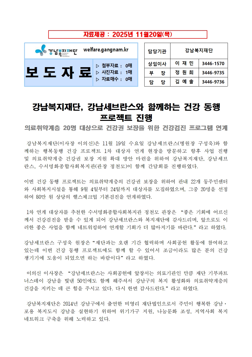 강남복지재단, 강남세브란스와 함께하는 건강 동행 프로젝트 진행