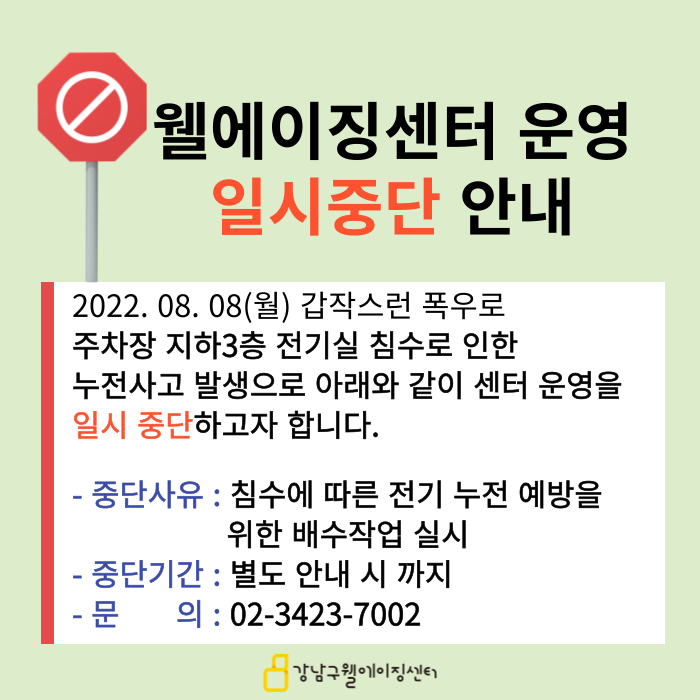 - 중단사유 : 센터 지하주차장 침수에 따른 전기 누전 예방을 위한 배수작업 등