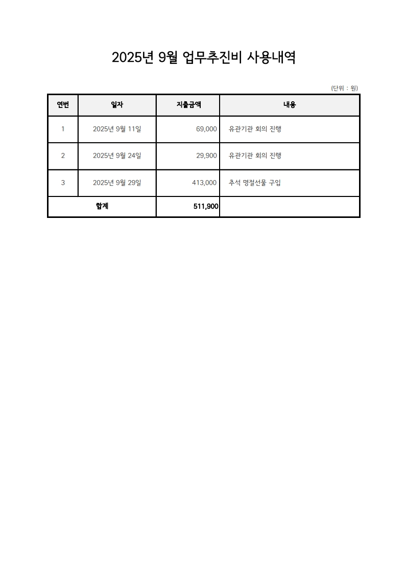 '사회복지법인 및 시설 업무추진비 공개 협의안'에 의거하여, 2025년 9월 업무추진비 사용 내역을 다음과 같이 공개합니다.