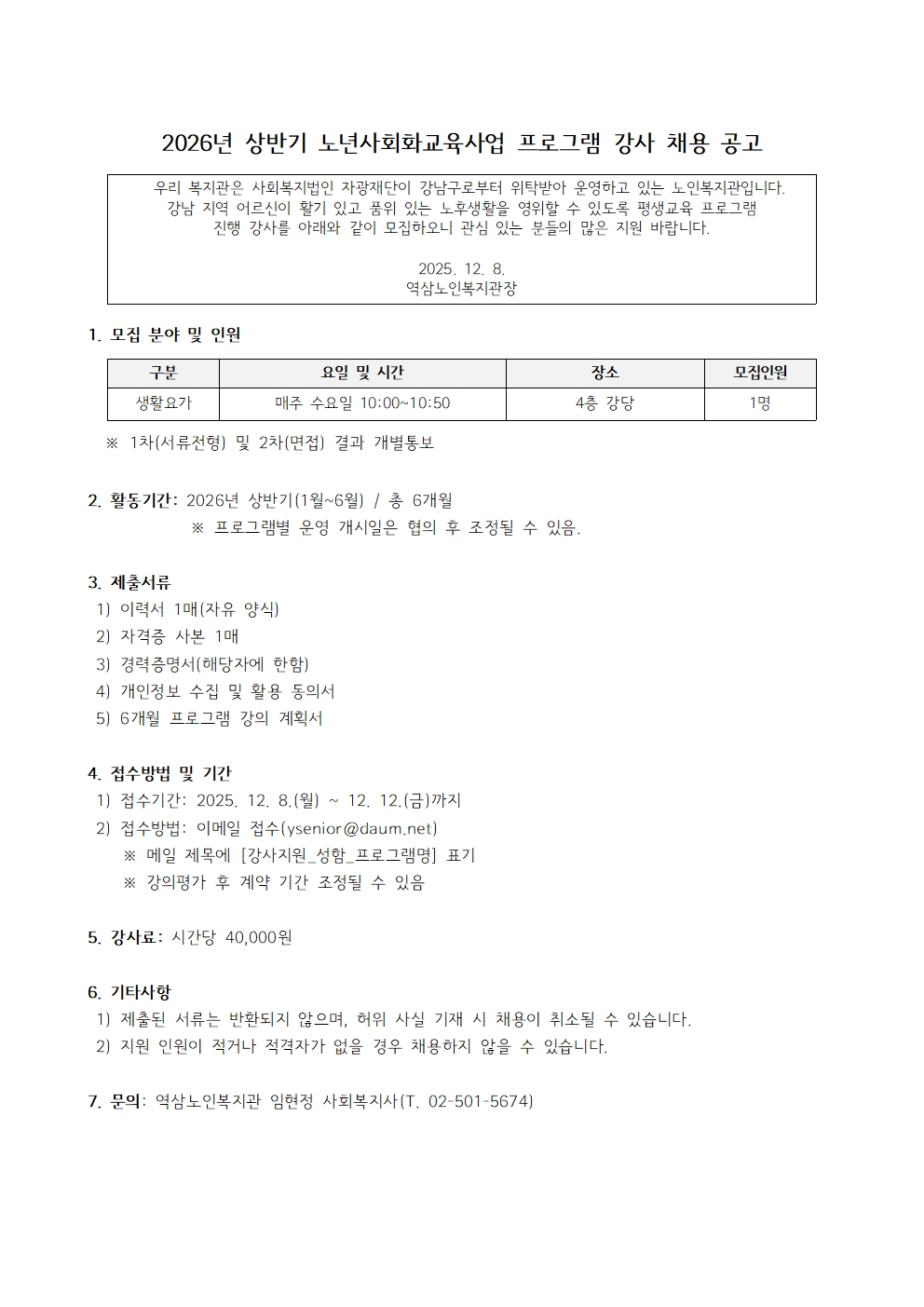 2026년 상반기 역삼노인복지관 평생교육 프로그램 생활요가 강사 모집