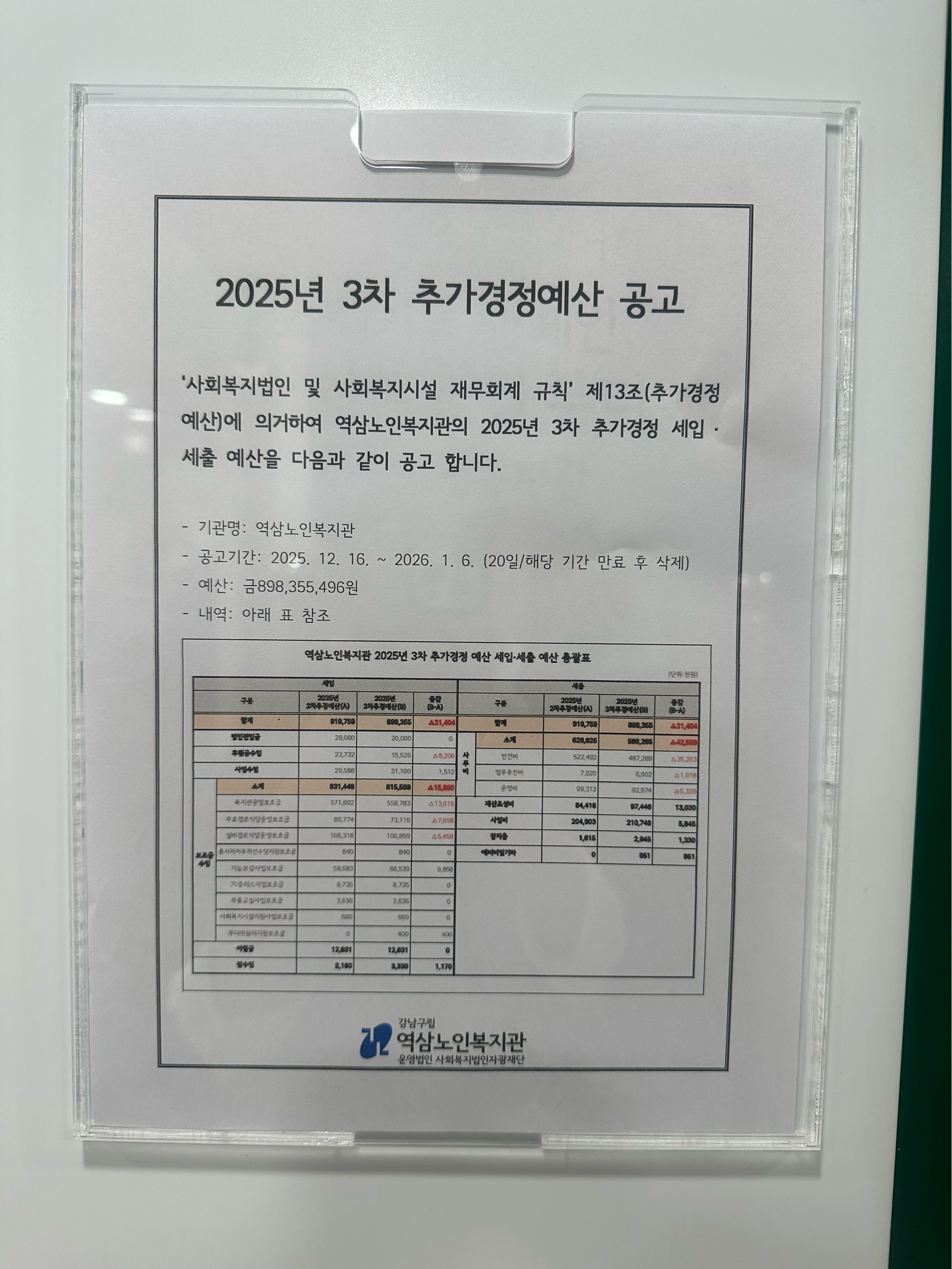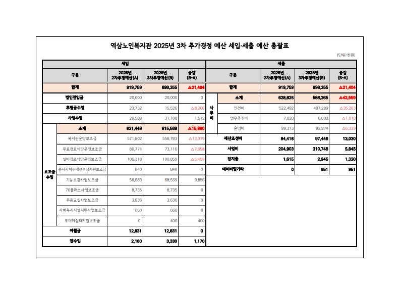 사회복지법인 및 사회복지시설 재무회계 규칙 제13조(추가경정예산)에 의거하여 역삼노인복지관 2025년 3차 추가경정 세입·세출 예산을 아래와 같이 공고합니다.