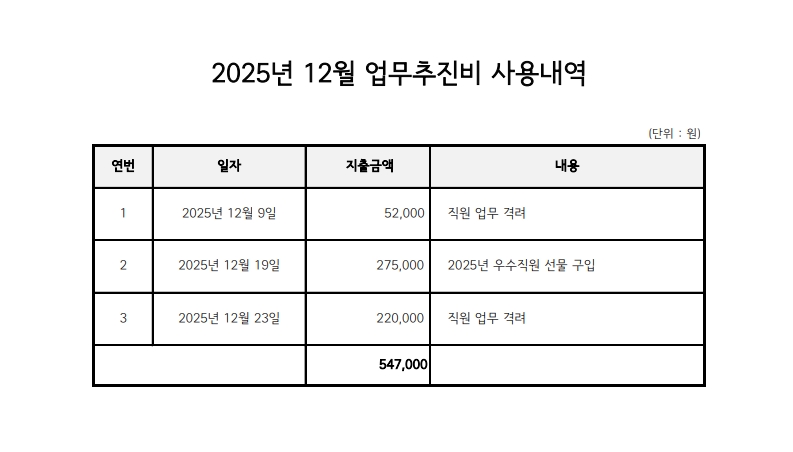 '사회복지법인 및 시설 업무추진비 공개 협의안'에 의거하여, 2025년 12월 업무추진비 사용 내역을 다음과 같이 공개합니다.