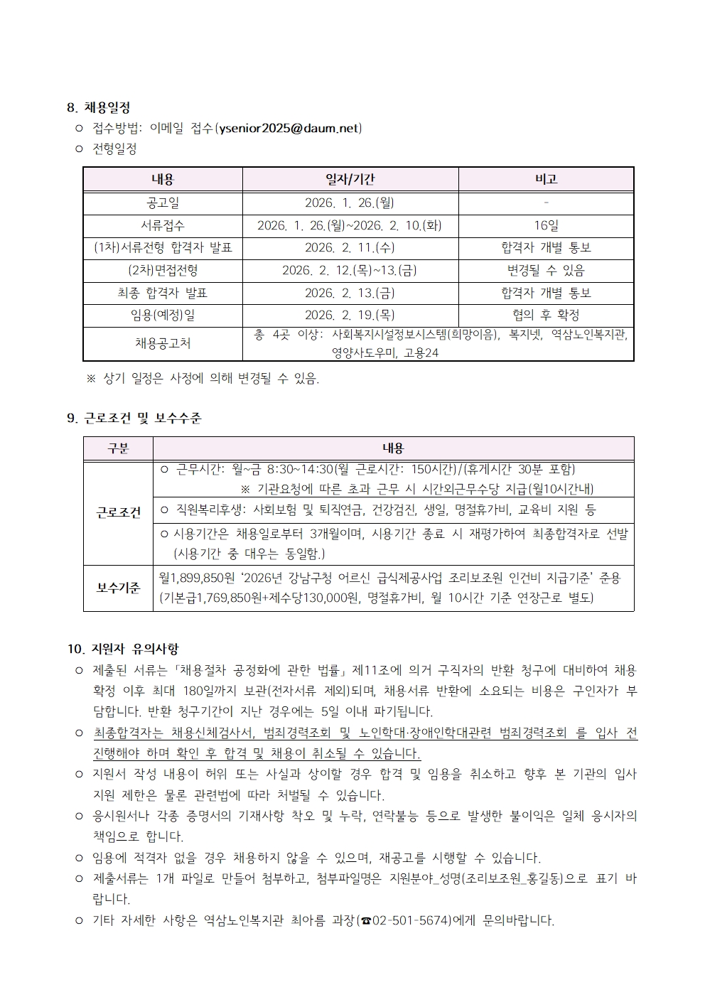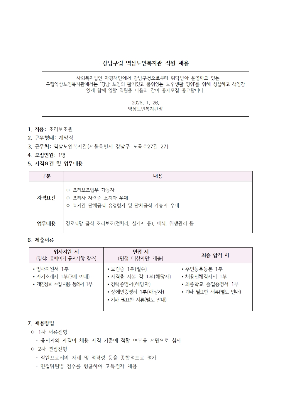 강남구립 역삼노인복지관 직원(조리보조원) 채용