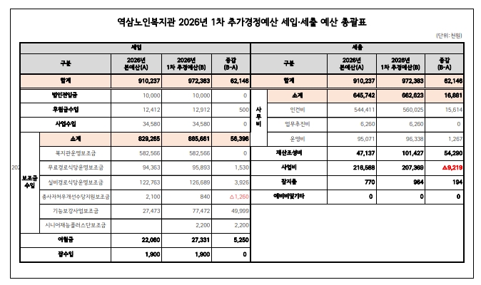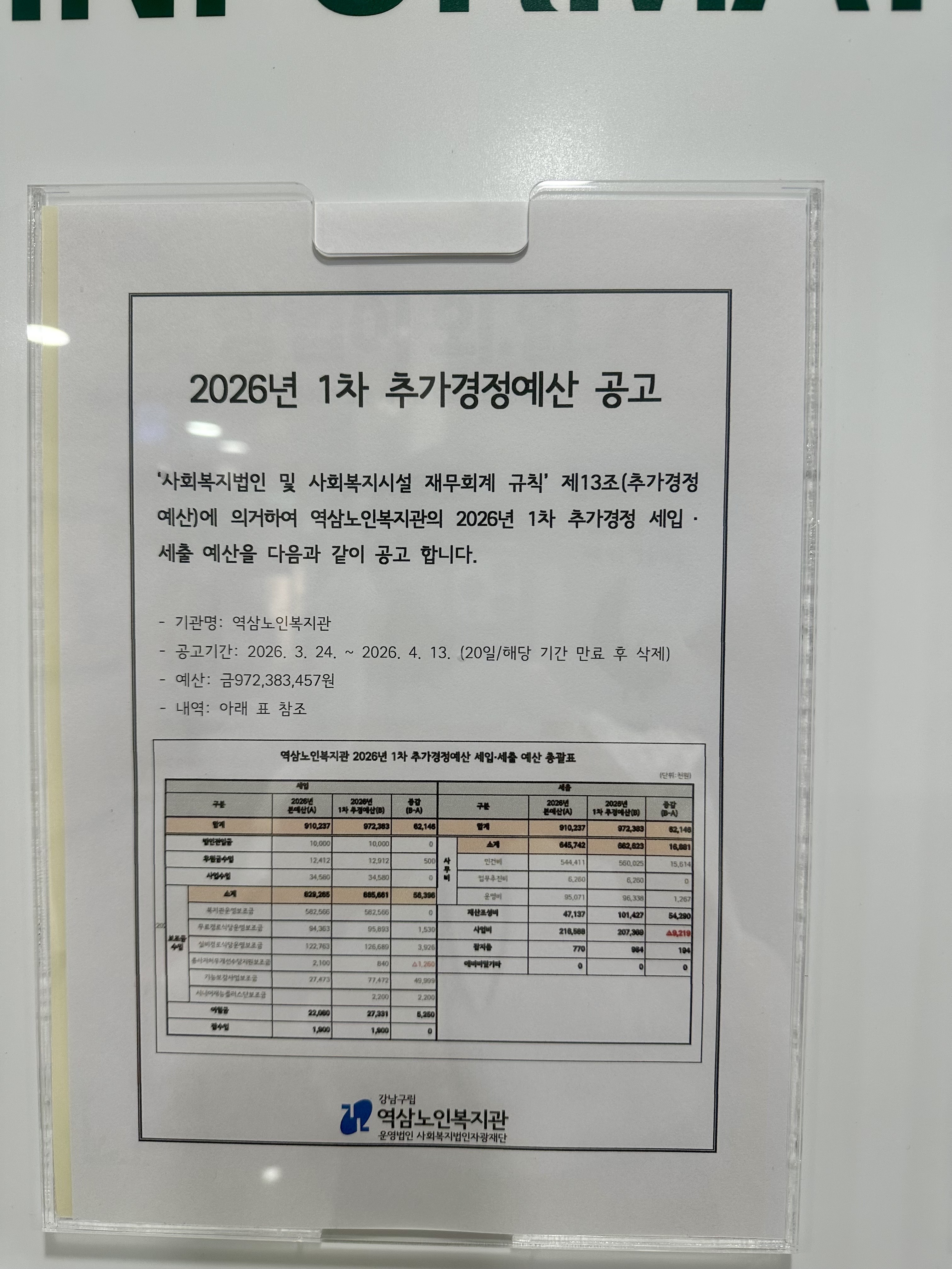 사회복지법인 및 사회복지시설 재무회계 규칙 제13조(추가경정예산)에 의거하여 역삼노인복지관 2026년 1차 추가경정 세입·세출 예산을 아래와 같이 공고합니다.