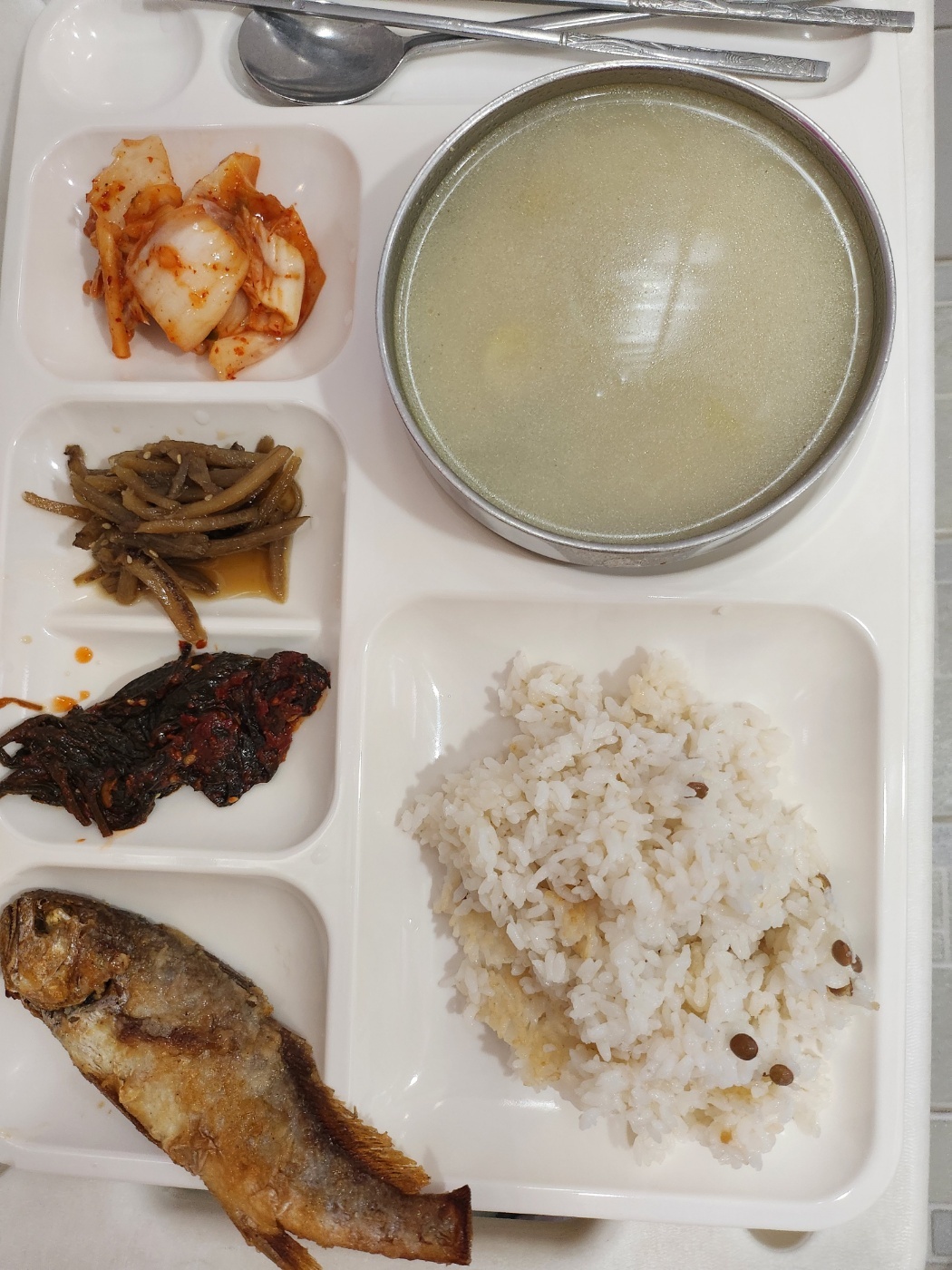 <중식>잡곡밥,우렁된장찌개 <간식> 오렌지 <석식>잡곡밥,들깨무채국,조기구이